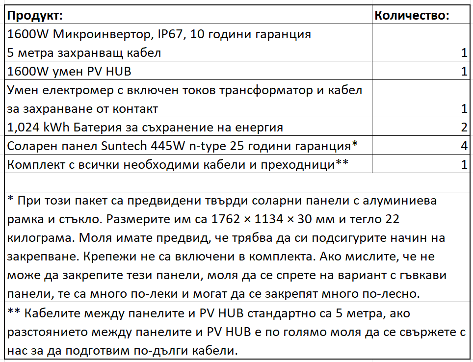 О: Пакета включва всичко необходимо, за да заработи системата. Нищо не се закупува допълнително освен в случай когато има специфични изисквания! Различните конфигурации се различават по мощността на инвертора и капацитета на батериите.