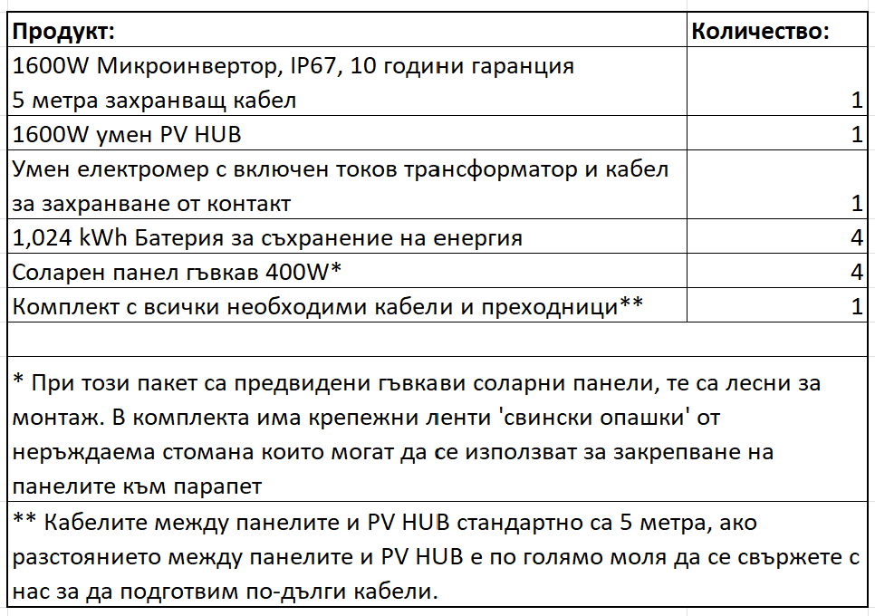 О: Пакета включва всичко необходимо, за да заработи системата. Нищо не се закупува допълнително освен в случай когато има специфични изисквания! Различните конфигурации се различават по мощността на инвертора и капацитета на батериите.