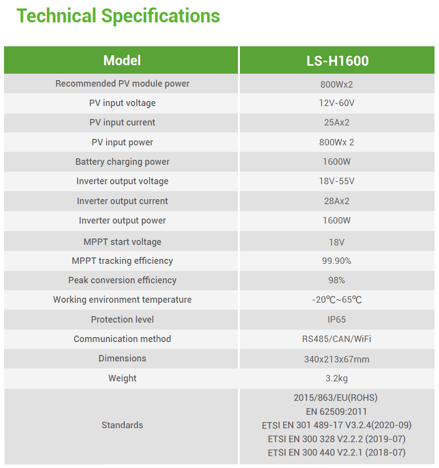 PV концентраторът LIONSHEE LS-H1600 има мощност от 1600 W и е подходящ за фотоволтаични системи за съхранение на енергия за балкони. Може да се свърже с шест LiFePO4 батерии с максимален капацитет от 6144 Wh, съхранявайки излишната енергия, генерирана през деня, и освобождавайки я през нощта за захранване на домакински товари, което ви помага да спестите разходи за енергия. Устройството е с метален корпус, охлажда се по естествен път, издръжливо е, има степен на защита IP65 и може да се адаптира към различни сурови условия. Вграден интелигентен Wi-Fi модул за наблюдение в реално време и идентифициране на повреди.